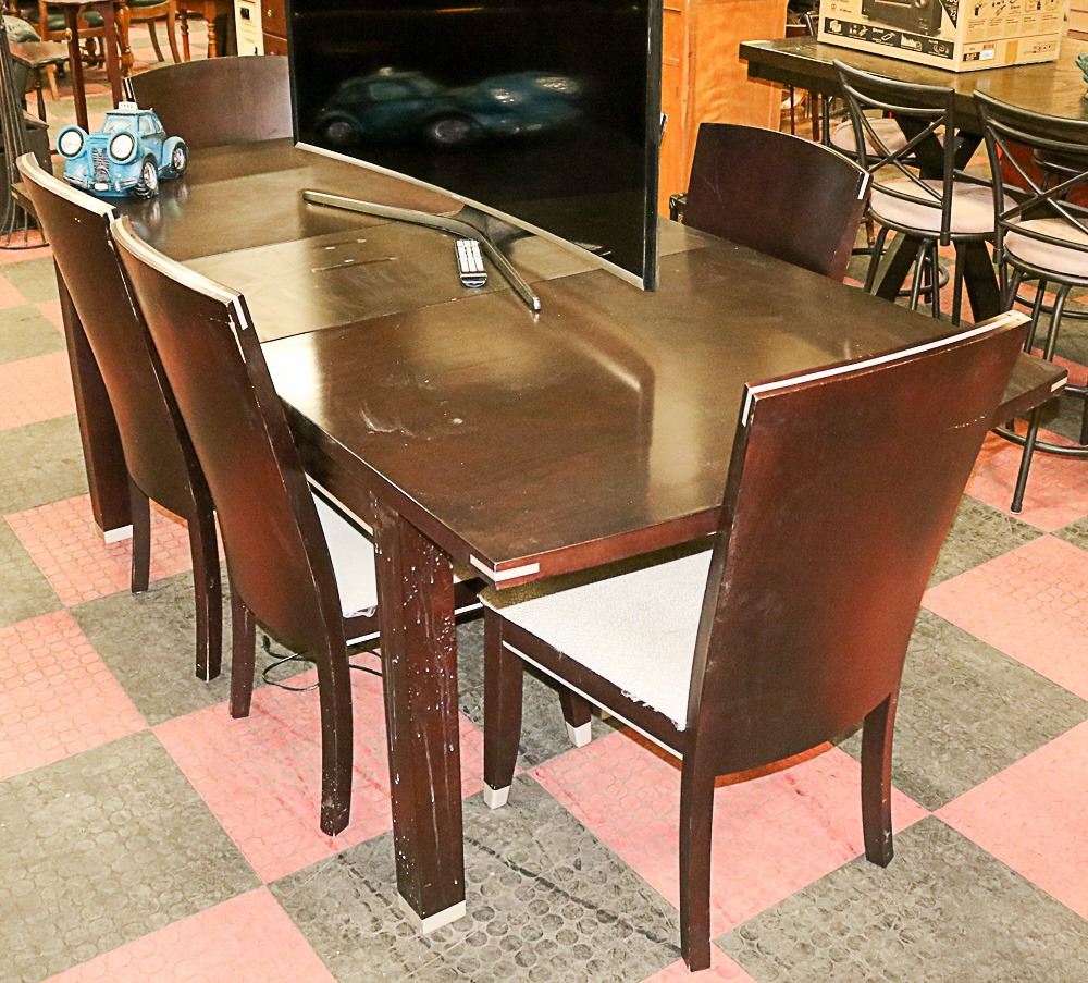 DARK WOOD TONE DINING ROOM TABLE WITH 6 CHAIRS