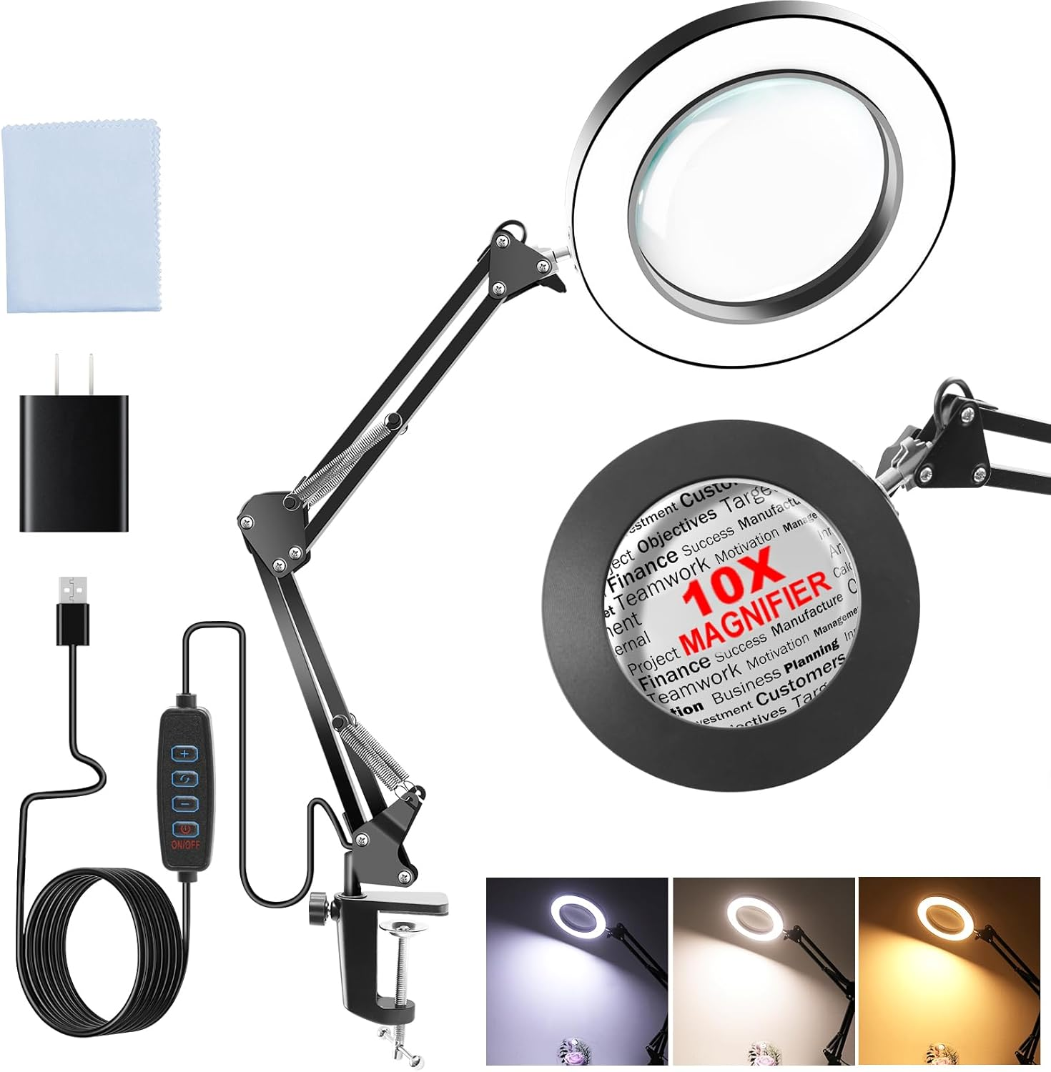 DAYAOCO 10X LIGHTED MAGNIFYING GLASS WITH LIGHT AND CLAMP, 3 COLOR MODES REAL GLASS LENS LIGHTED MAGNIFIER WITH STAND - FOR CLOSE WORK, REPAIR, PAINTING, READING, CRAFTS, JEWELRY