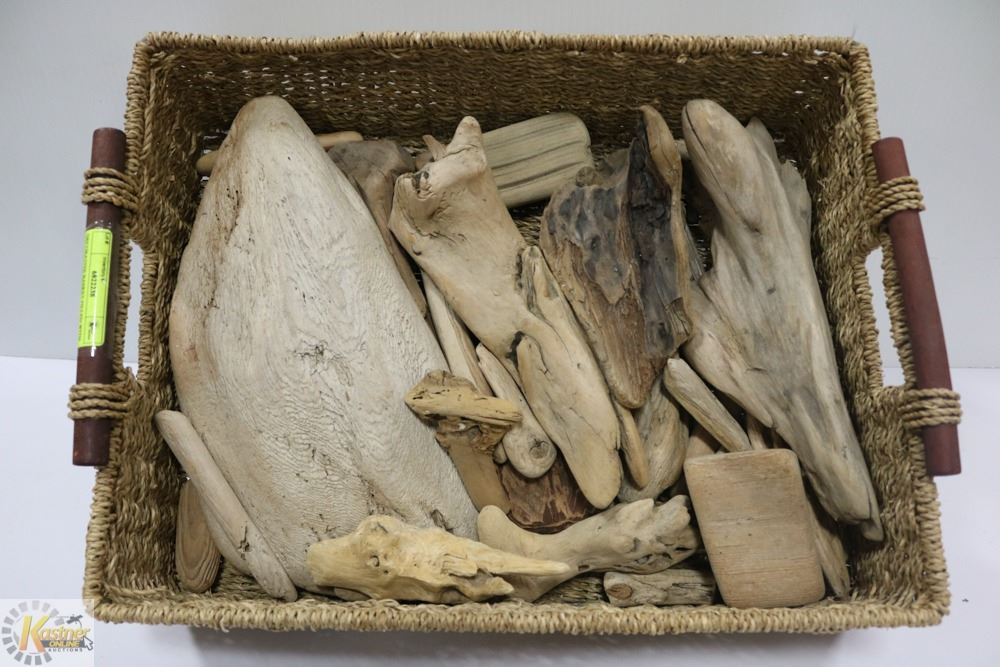 DECORATIVE BASKET FILLED WITH DRIFTWOOD PIECES