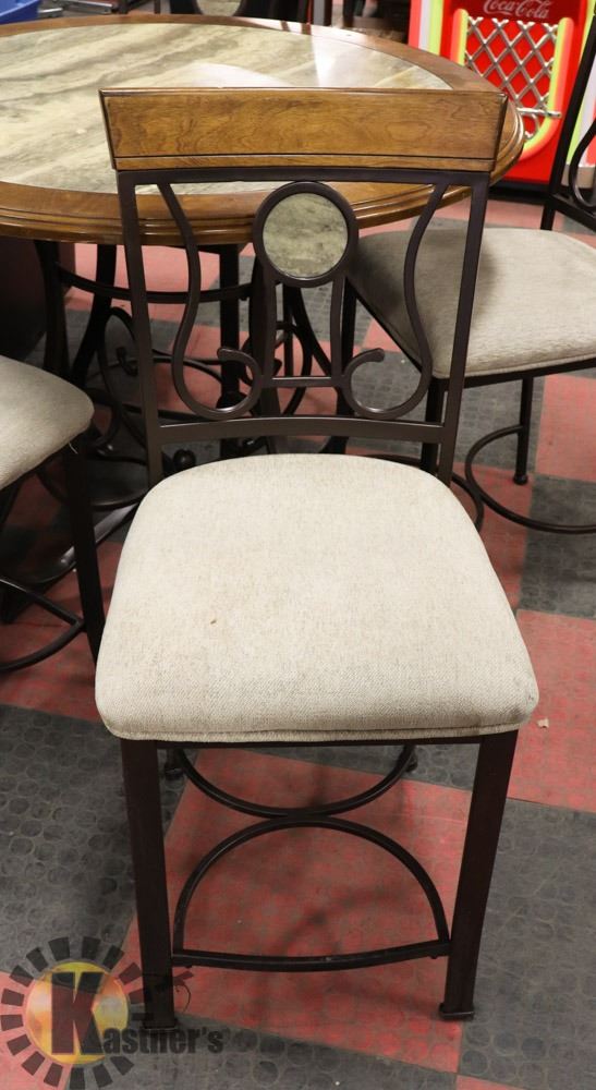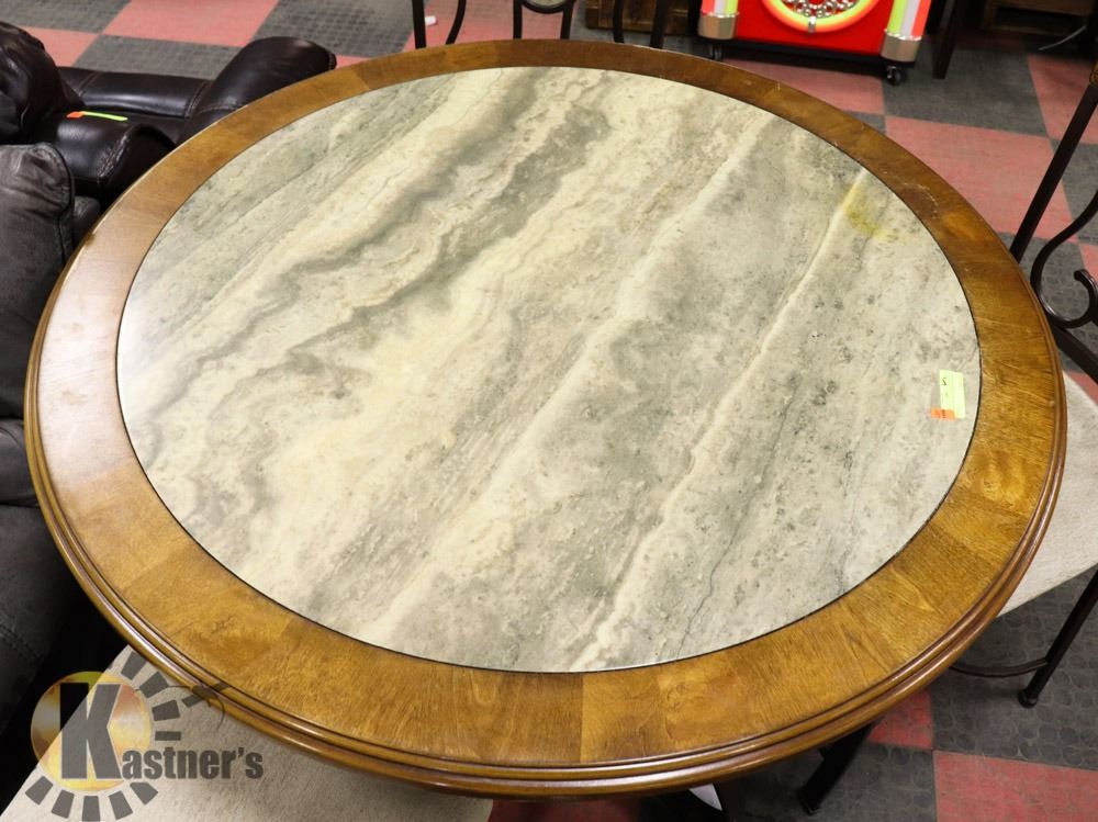 DINING TABLE SET WITH 4 PADDED SEAT METAL CHAIRS WITH WOOD AND MARBLE ACCENTS (TABLE: 46"-DIAMETER X 36"H) - FURNITURE