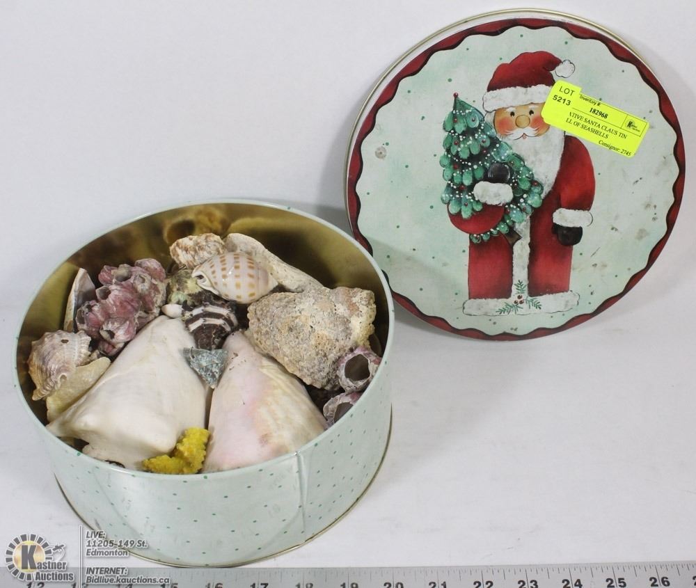 DECORATIVE SANTA CLAUS TIN BOX FULL OF SEASHELLS