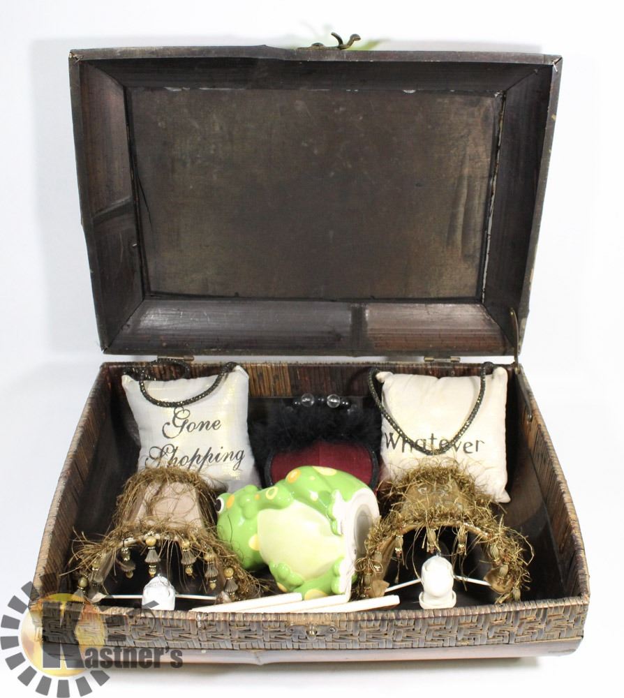 (18"L X 13"W X 6.5"H) FILLED WITH 2 DECORATIVE NIGHT LIGHTS WITH SWITCHES, DOOR DECOR, CHEETAH COASTERS & FROG PIGGY BANK - GENERAL, HOUSEHOLD