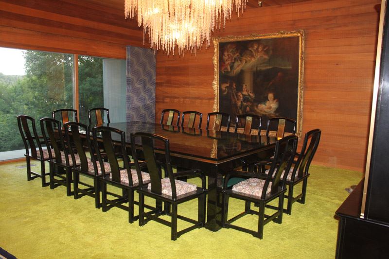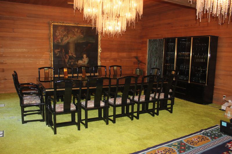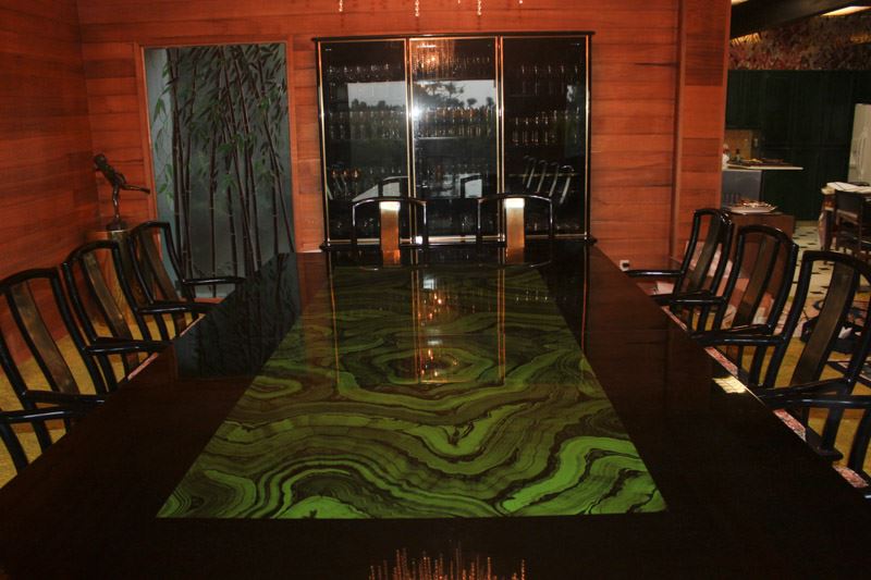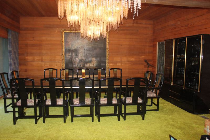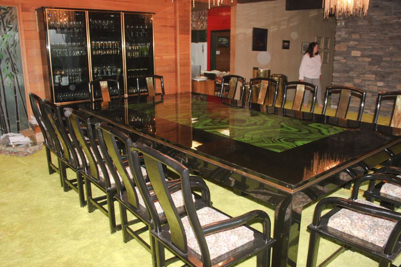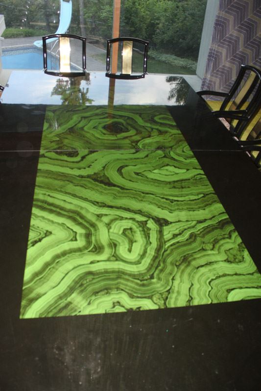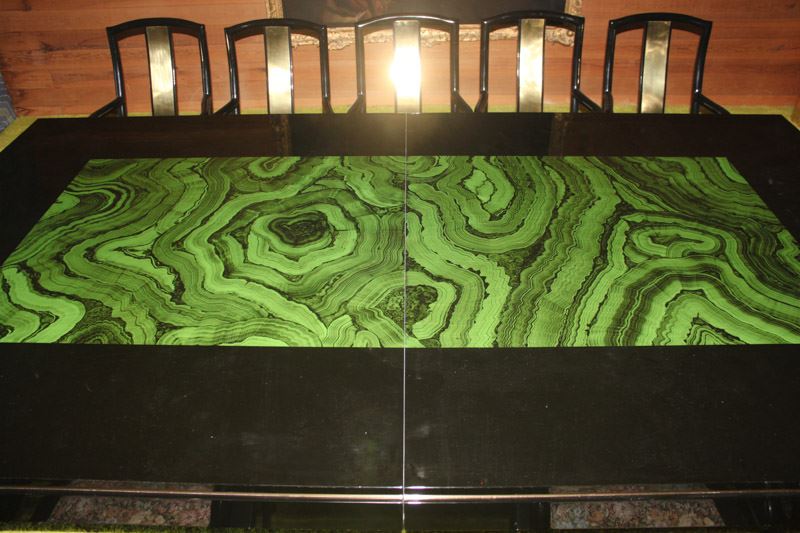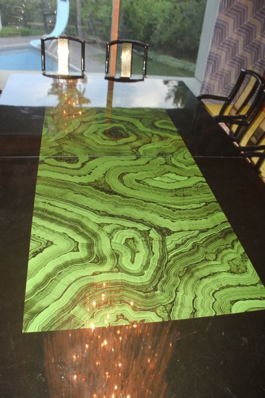 MALACHITE TABLE FROM THE ELESSANDRO COLLECTION - DIMENSIONS: 68 INCHES X 120 INCHES 2-24" LEAFS, IT REPRODUCES NATURAL MALACHITE IN ITS MATRIX WAS USED IN IMPERIAL "RUSSIAN -FRENCH" FURNITURE CHAIRS: 14 CHAIRS: ... ANWAR SADAT FORMER PRIMINISTER OF EGYPT HAD THESE EXACT CHAIRS IN HIS PALACE CHINA CABINET: 76.5 INCHES WIDE 78.5 TALL X 18 " TALL NOTE SOME DAMAGE TO TABLE TOP