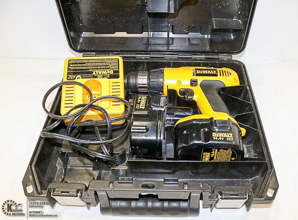 DEWALT 14.4v DRILL, CHARGER, CASE AND BATTERIES