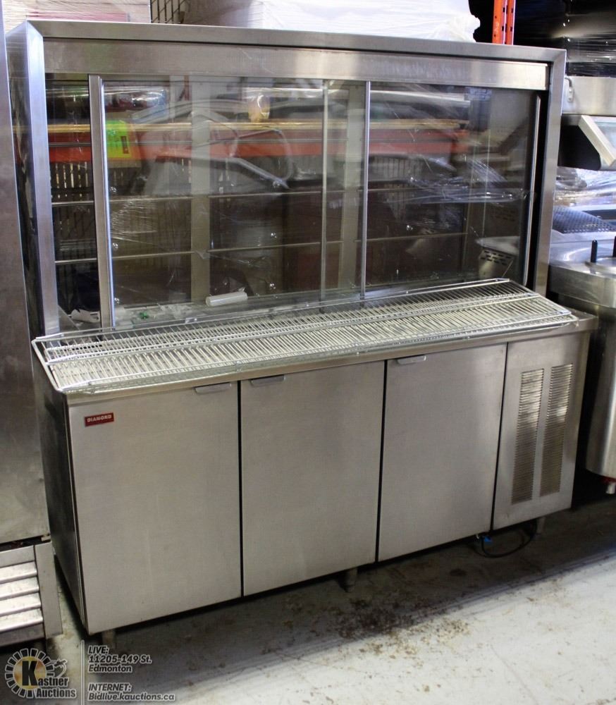 3 DOOR BOTTOM REFRIGERATION. GLASS ON FILLING SIDE OF UNIT IS BROKEN. 72": X72" X 31"