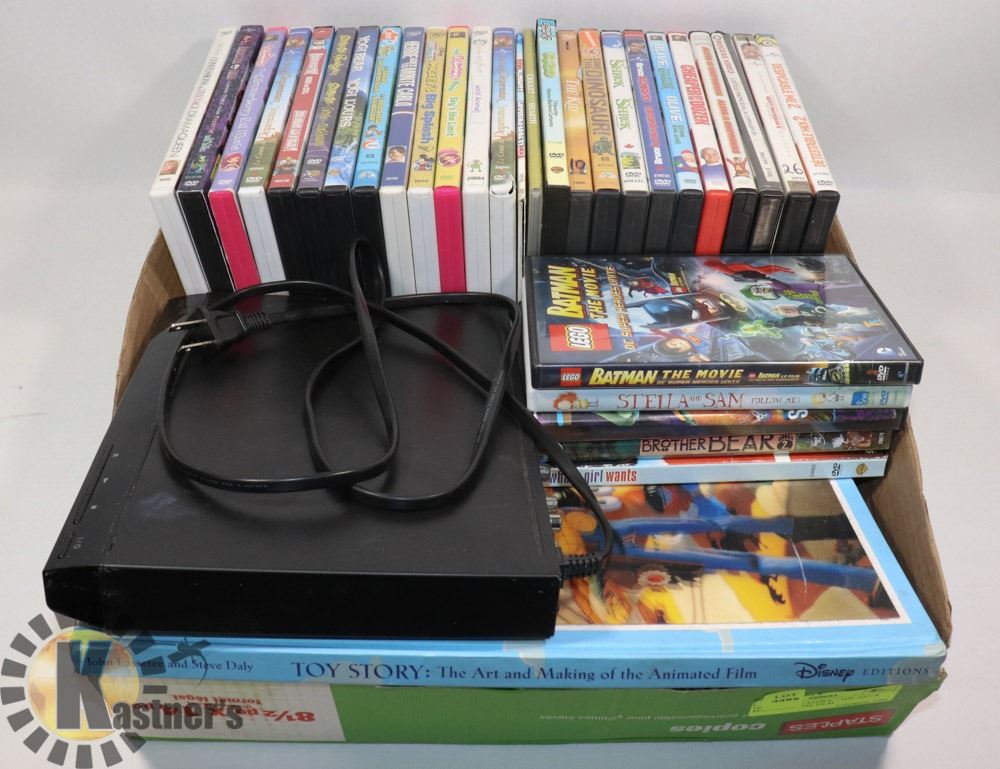 BOOK W/ A FLAT OF KIDS DVD'S AND A DVD PLAYER - COLLECTABLE, ELECTRONICS