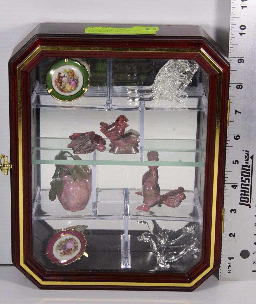 DISPLAY CASE OF JADE,CRYSTAL,LIMOGES COLLECTIBLES