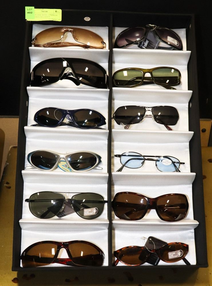 DISPLAY CASE WITH 12 PAIRS OF DESIGNER SUNGLASSES.