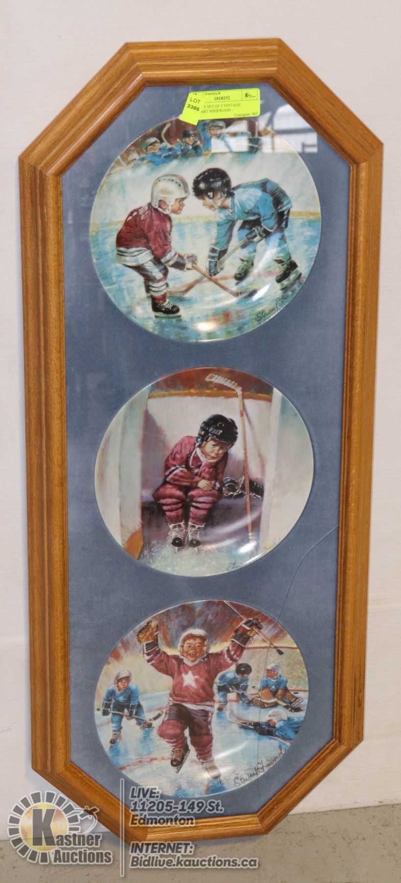 BRADFORD EXCHANGE NUMBERED COLLECTIBLE PLATES - "THE FACE OFF", "TWO MINUTES TRIPPING" AND "HE SHOOTS HE SCORES" (CRACK ON BOTTOM RIGHT SIDE OF GLASS) - MEASURES: 33"H X 14"W