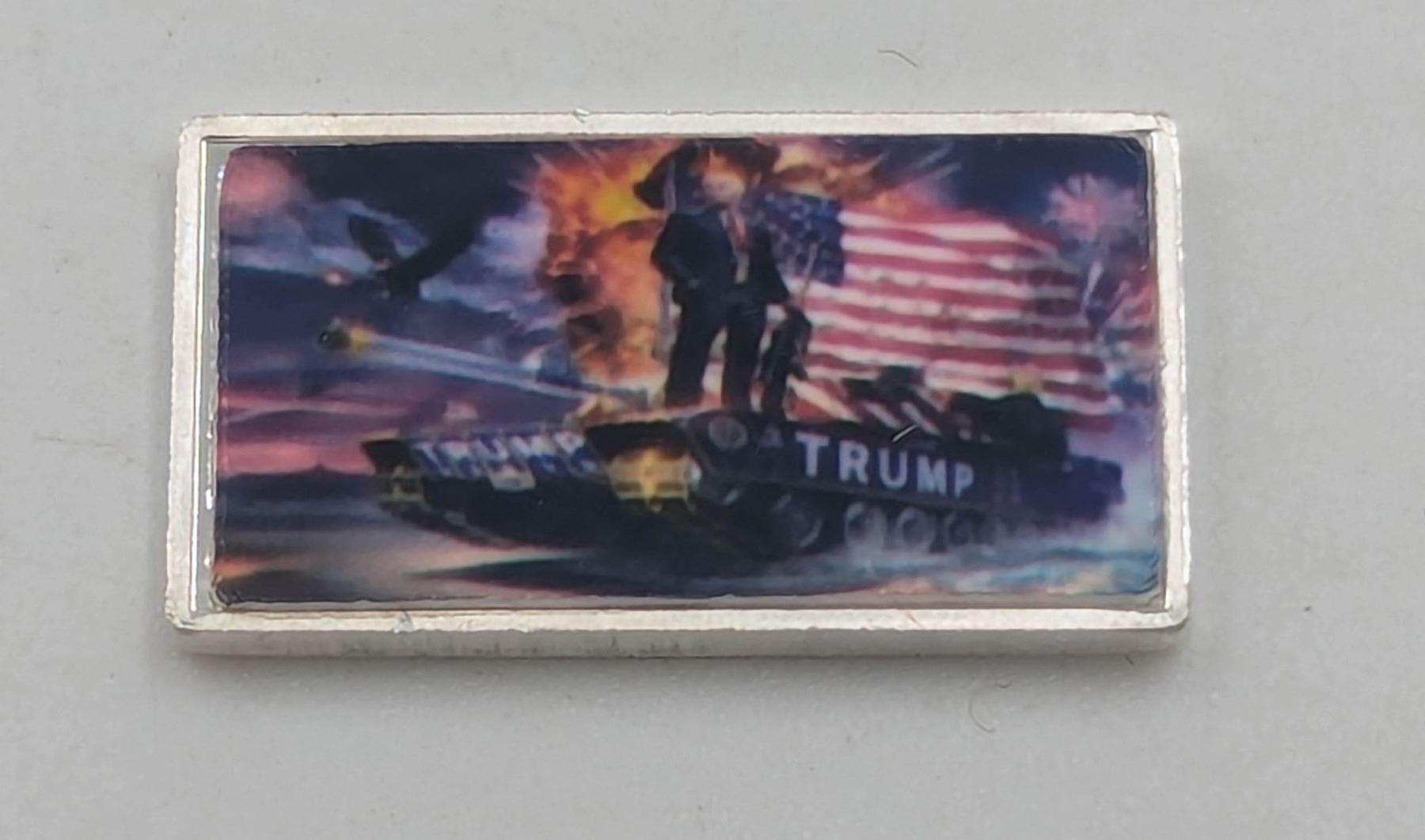 DONALD TRUMP ON TANK  1/10 OZ FINE SILVER BAR