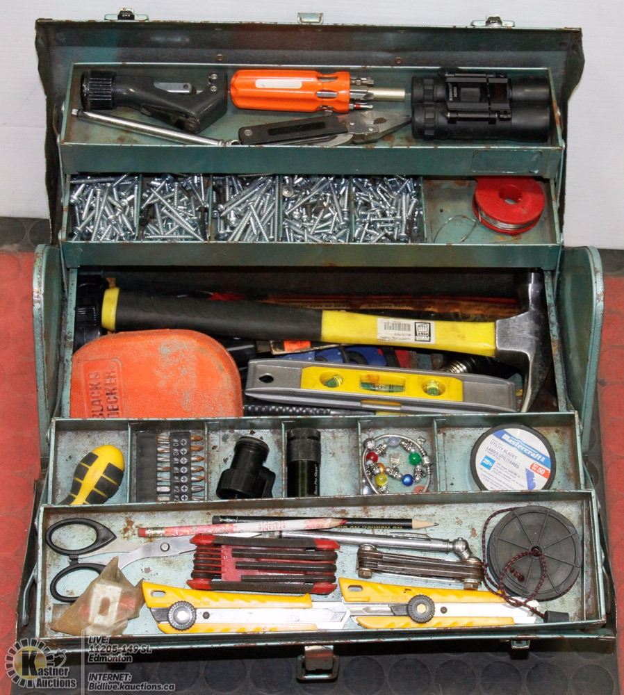 DOUBLE OPENING TOOL BOX FULL OF ASSORTED TOOLS