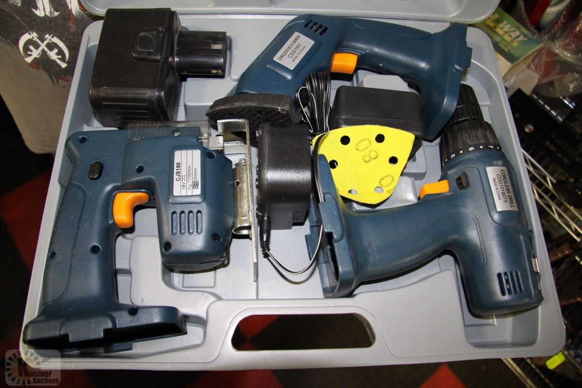 DRILL, JIGSAW, SANDER COMBO WITH BATTERY IN CASE