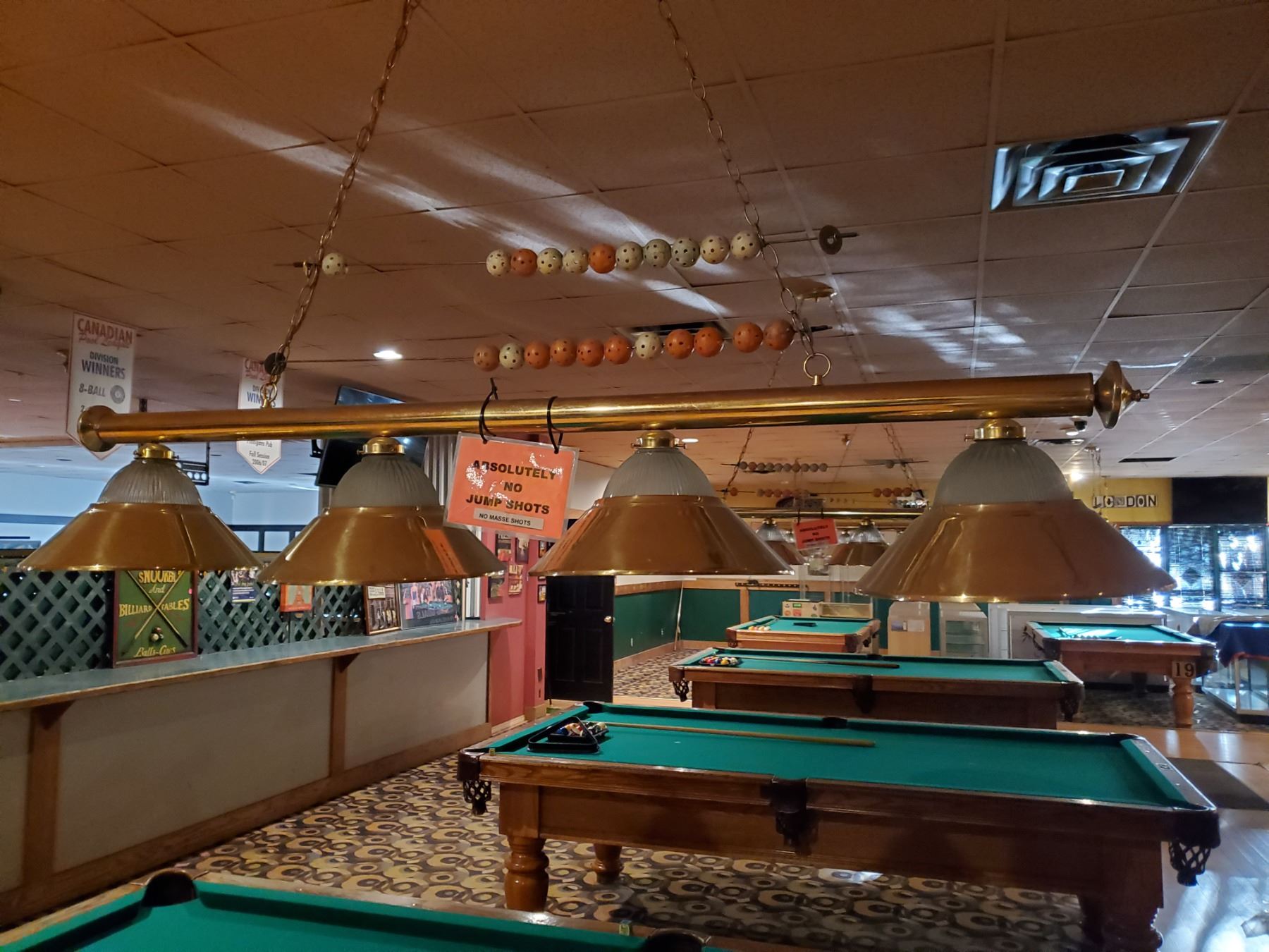 RACK, EXTENSION CUE AND 4 PENDANT HANGING POOL TABLE LAMP. REMOVAL IS THE RESPONSIBILITY OF THE BUYER