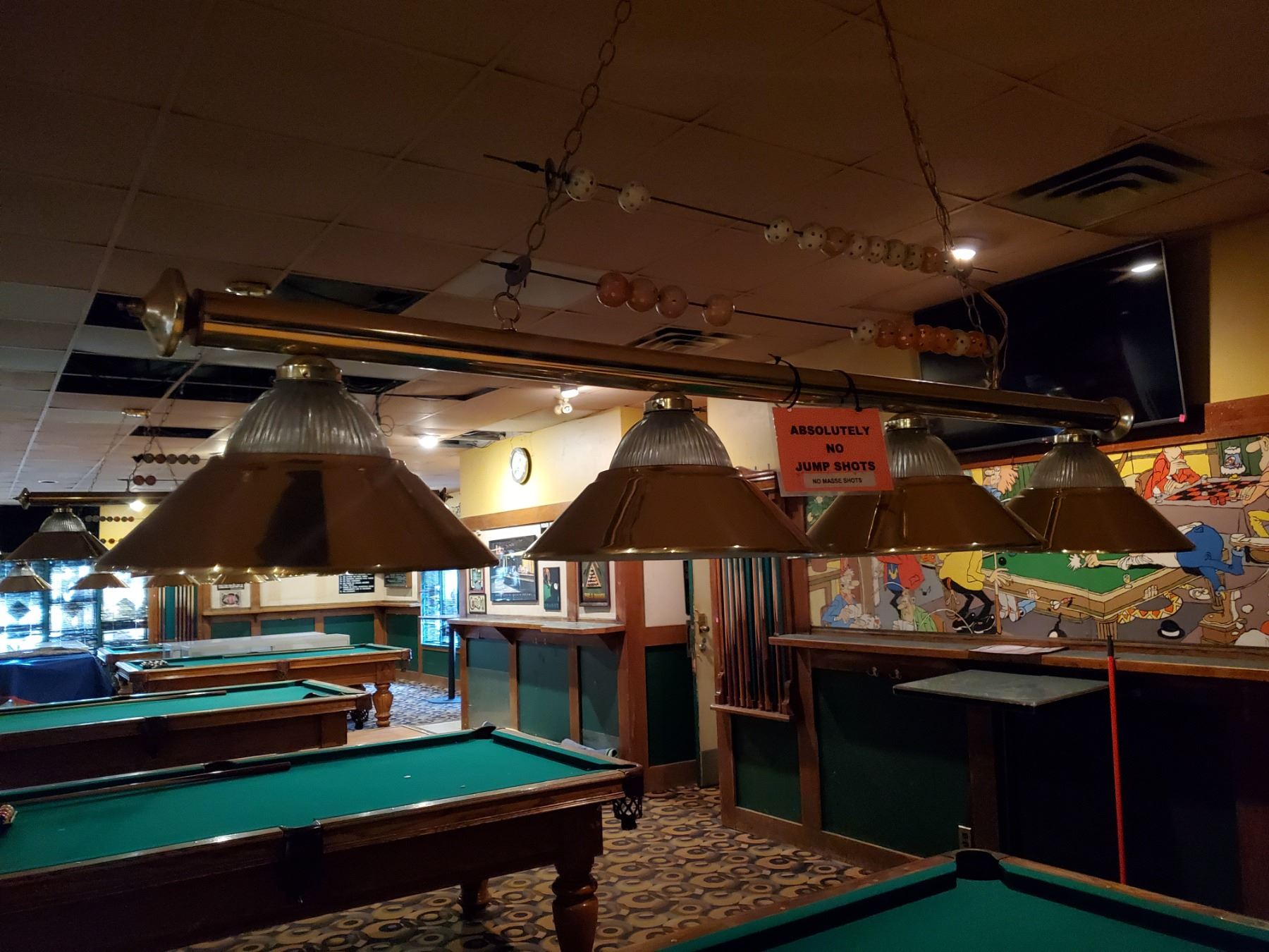 RACK, EXTENSION CUE AND 4 PENDANT HANGING POOL TABLE LAMP. REMOVAL IS THE RESPONSIBILITY OF THE BUYER