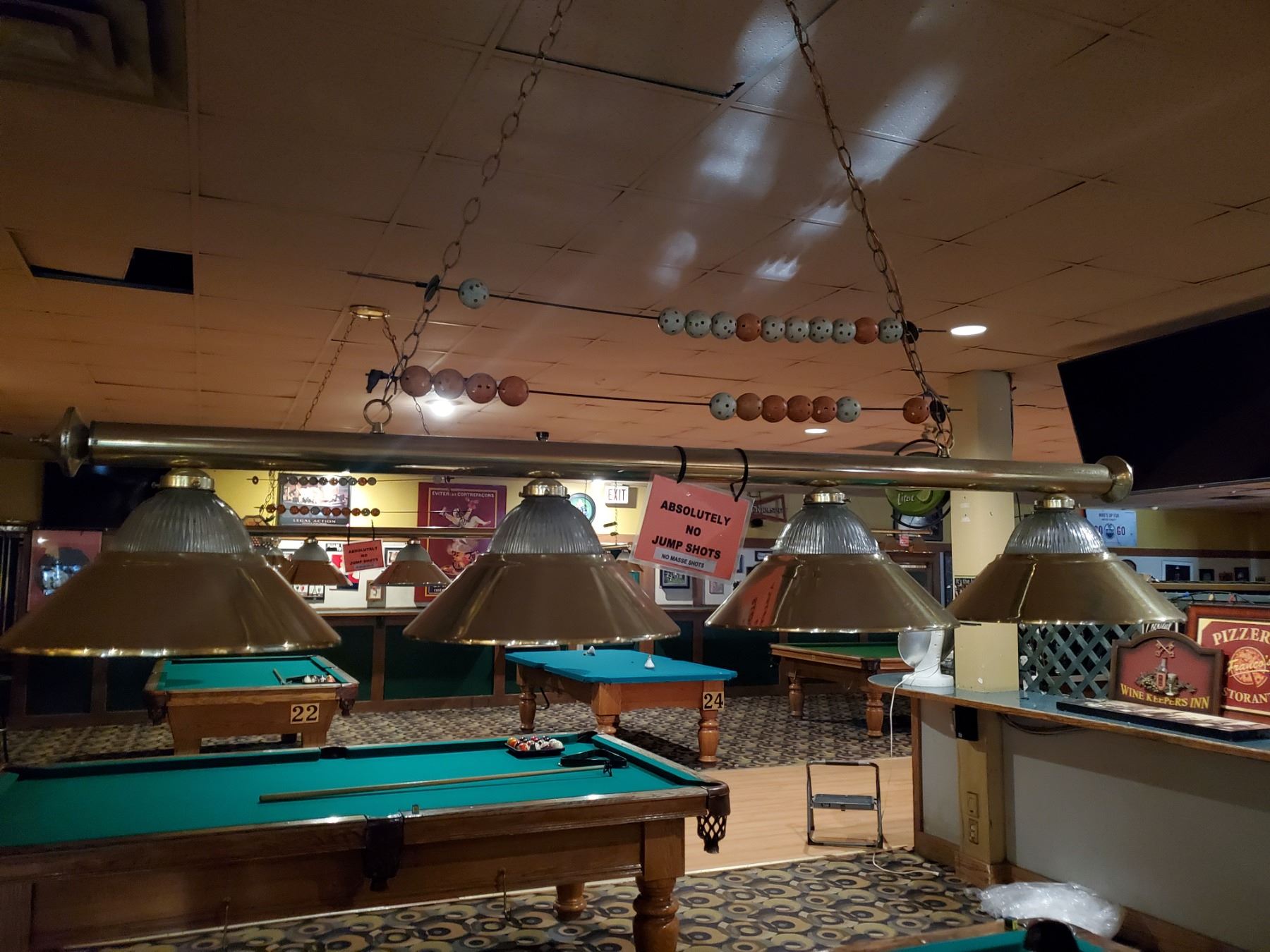 RACK, EXTENSION CUE AND 4 PENDANT HANGING POOL TABLE LAMP. REMOVAL IS THE RESPONSIBILITY OF THE BUYER