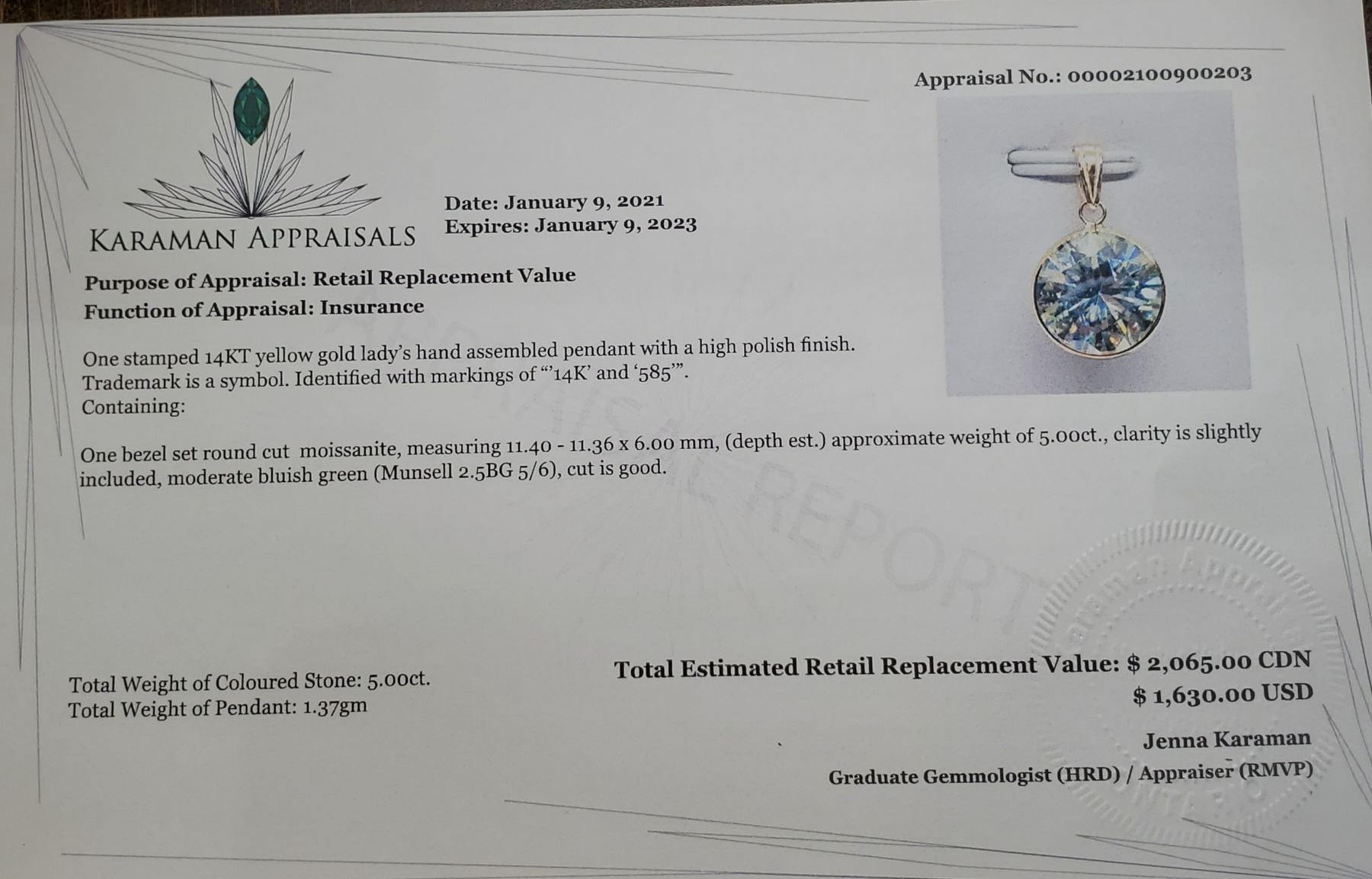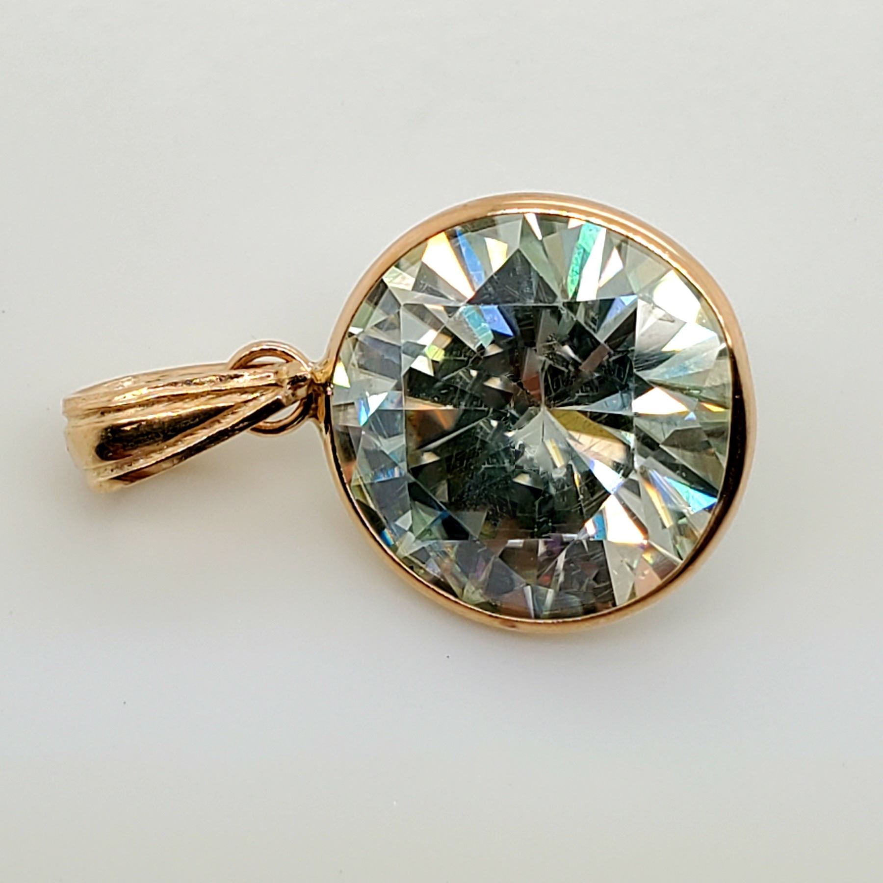 14K YELLOW GOLD MOISSANITE(5CT) HAND ASSEMBLED,1 BEZEL SET ROUND CUT MODERATE BLUISH GREEN MOISSANITE PENDANT, WEIGHT 1.37G, MADE IN CANADA, APPRAISED RETAIL $1900 **ALL ITEMS MUST BE REMOVED BY 5PM SATURDAY, MAY 27TH 2023. ALL REMAINING ITEMS WILL BE SUBJECT TO A $6.00 PER DAY STORAGE CHARGE. ANY ITEMS REMAINING AFTER MONDAY, JUNE 12TH, 2023 WILL BE CONSIDERED FORFEITED. NO REFUNDS WILL BE ISSUED FOR FORFEITED ITEMS. TO SCHEDULE A PICK UP APPOINTMENT CLICK HERE