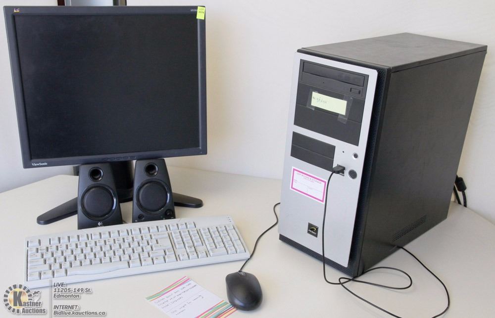 19" MONITOR, MONITOR RISER, KEYBOARD, MOUSE AND SPEAKERS. ALL INFORMATION ON HARD DRIVE HAS BEEN REMOVED DUE TO SECURITY AND PRIVACY REASONS.