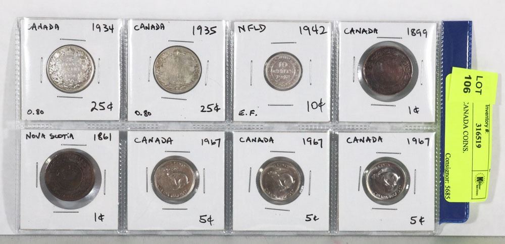 25 CENTS 1934 & 1935; ONE CENT 1899; THREE FIVE CENTS 1967; NOVA SCOTIA CENT 1861; NEWFOUNDLAND TEN CENT 1942. CURRENCY.