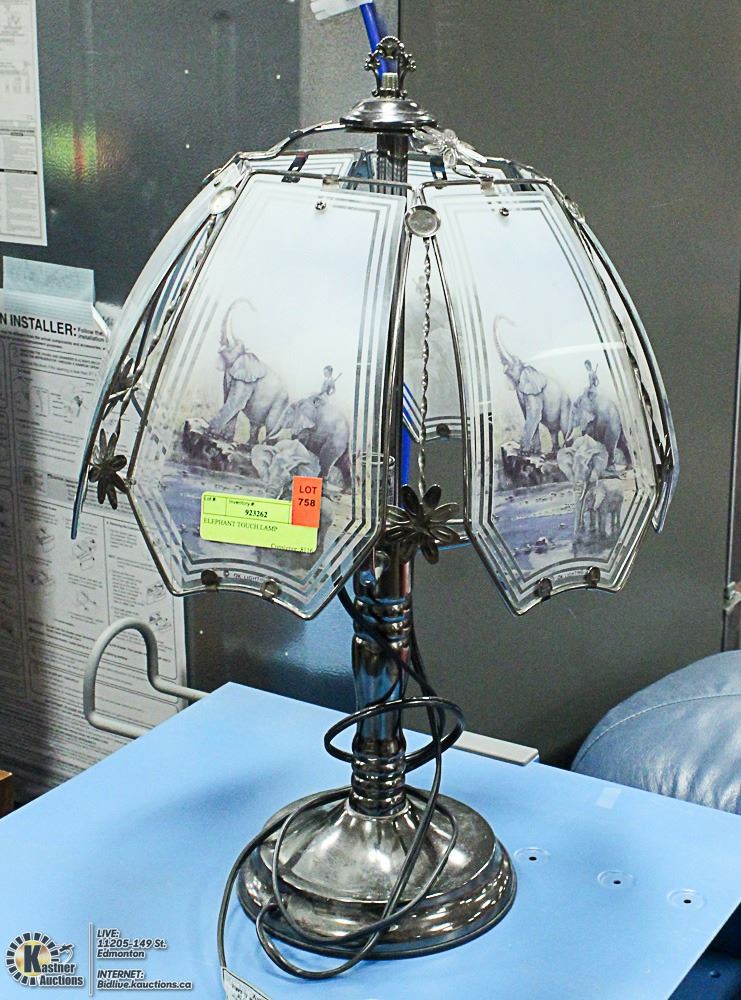 ELEPHANT TOUCH LAMP, GLASS PANEL SILVER BASE 22" TALL