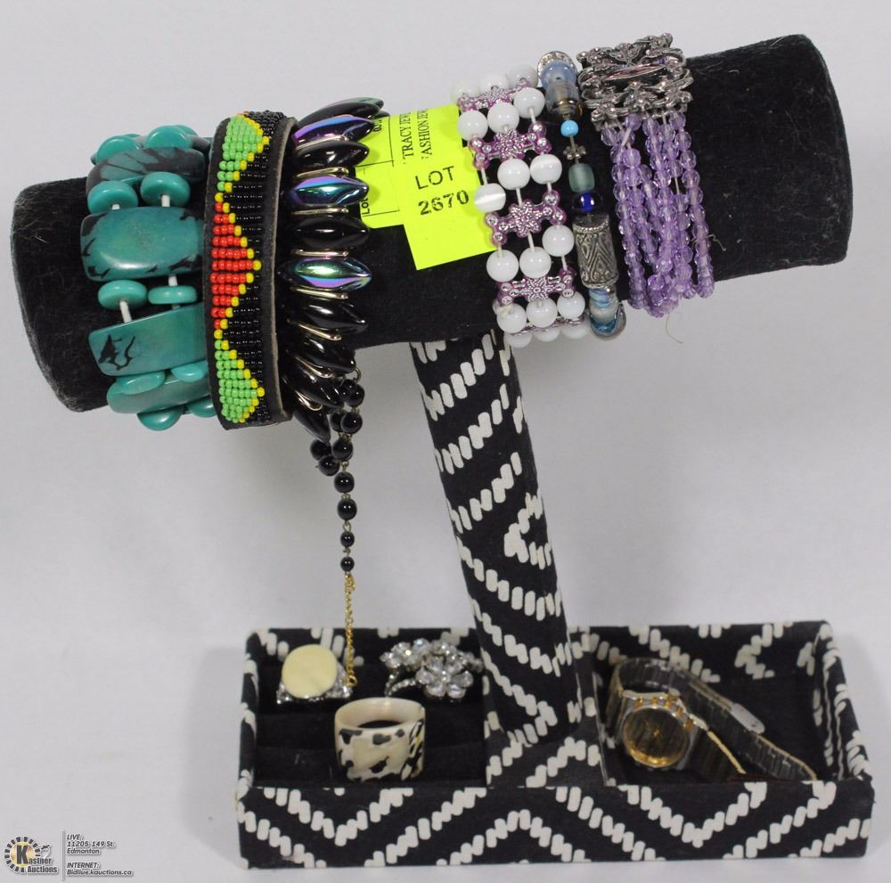 BRACELETS RINGS AND A WATCH ON AN ELLEN TRACY JEWELRY STAND