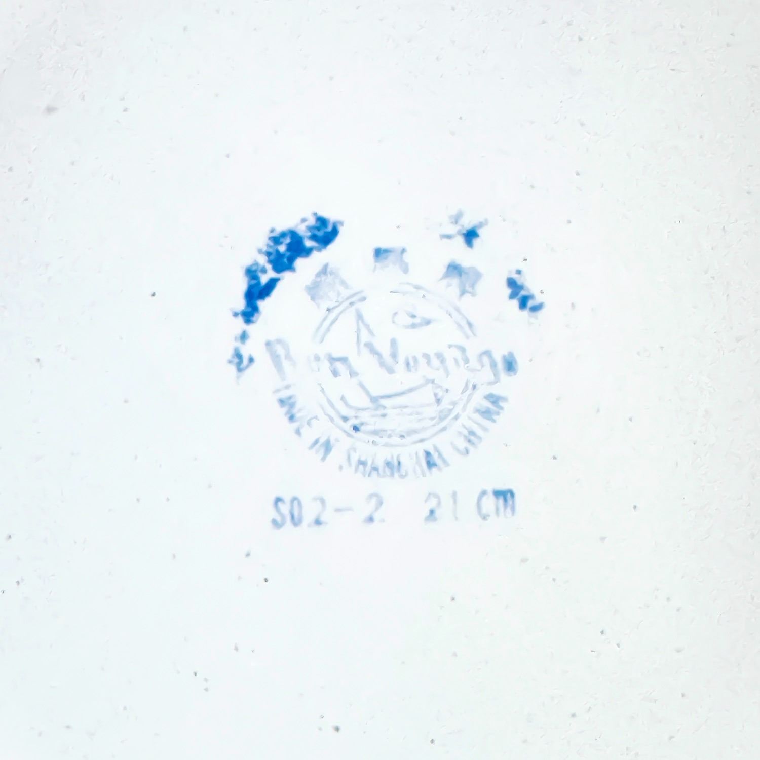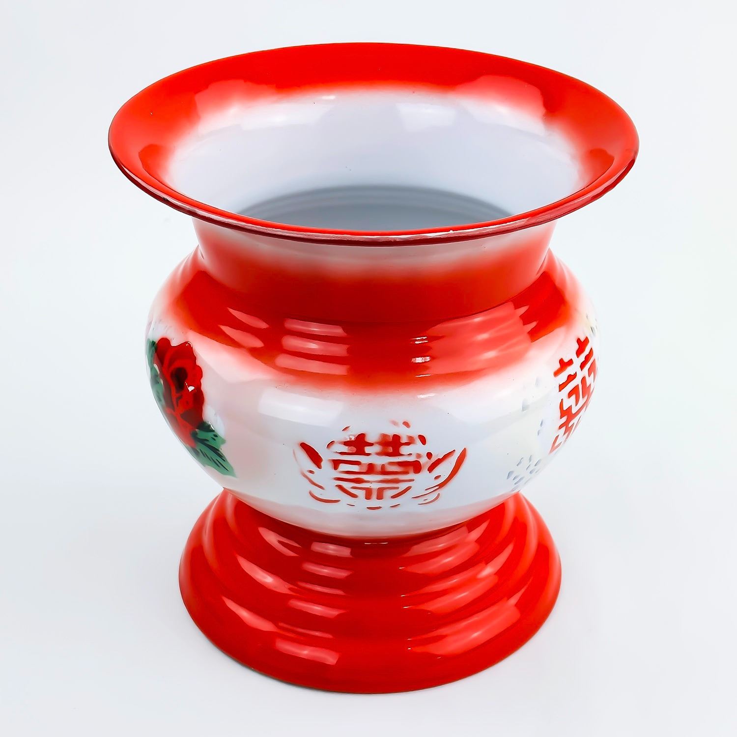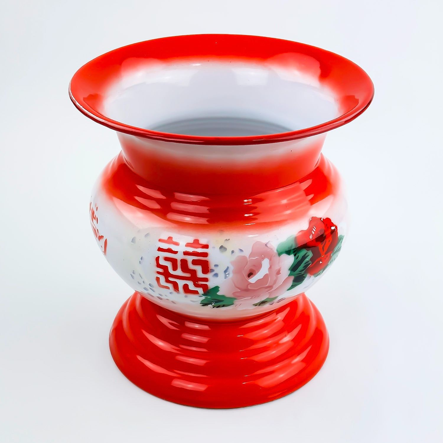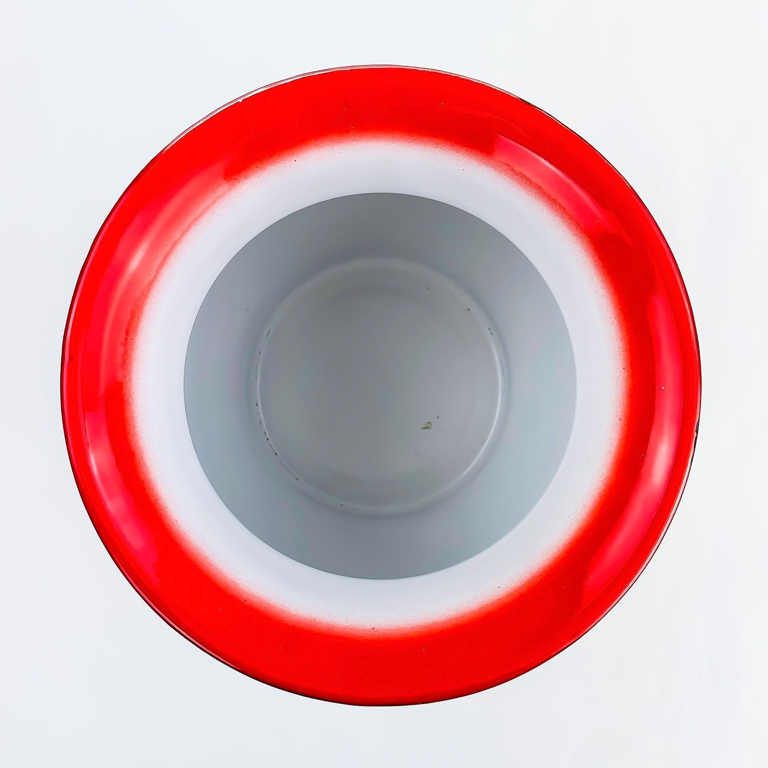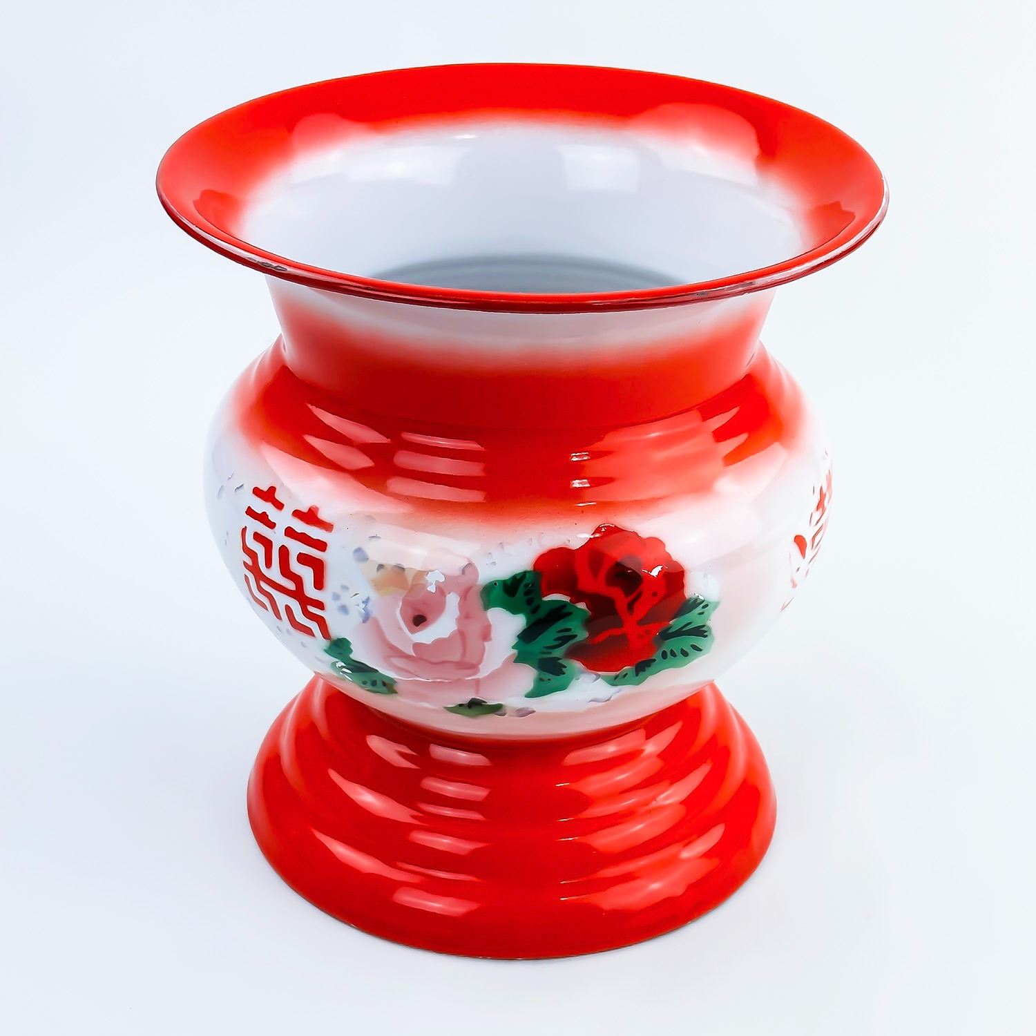 #8314 - LARGE RED AND WHITE ENAMELWARE POT, VASE, BOWL OR WINE CHILLER - HAS MANY USES. FLORAL ROSE THEMED DESIGN AND MARKED BON VOYAGE - MADE IN SHANGHAI CHINA ON BOTTOM. MEASURES: 8.75” (22 CM) HIGH BY 8.25” (21 CM) TOP DIAMETER