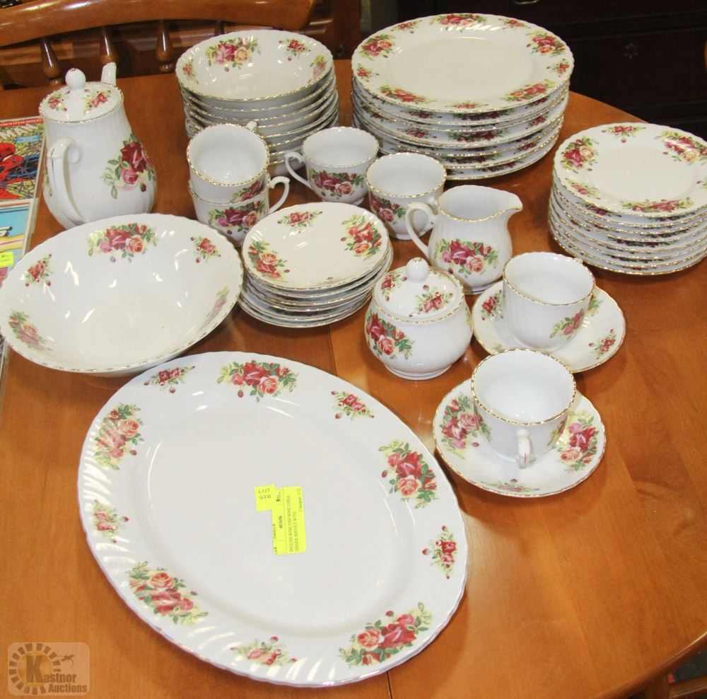 8 PC SETTING INCL TEA POT,SUGAR , CREAMER,SERVING PLATTERS,BOWLS CUPS AND SAUCERS