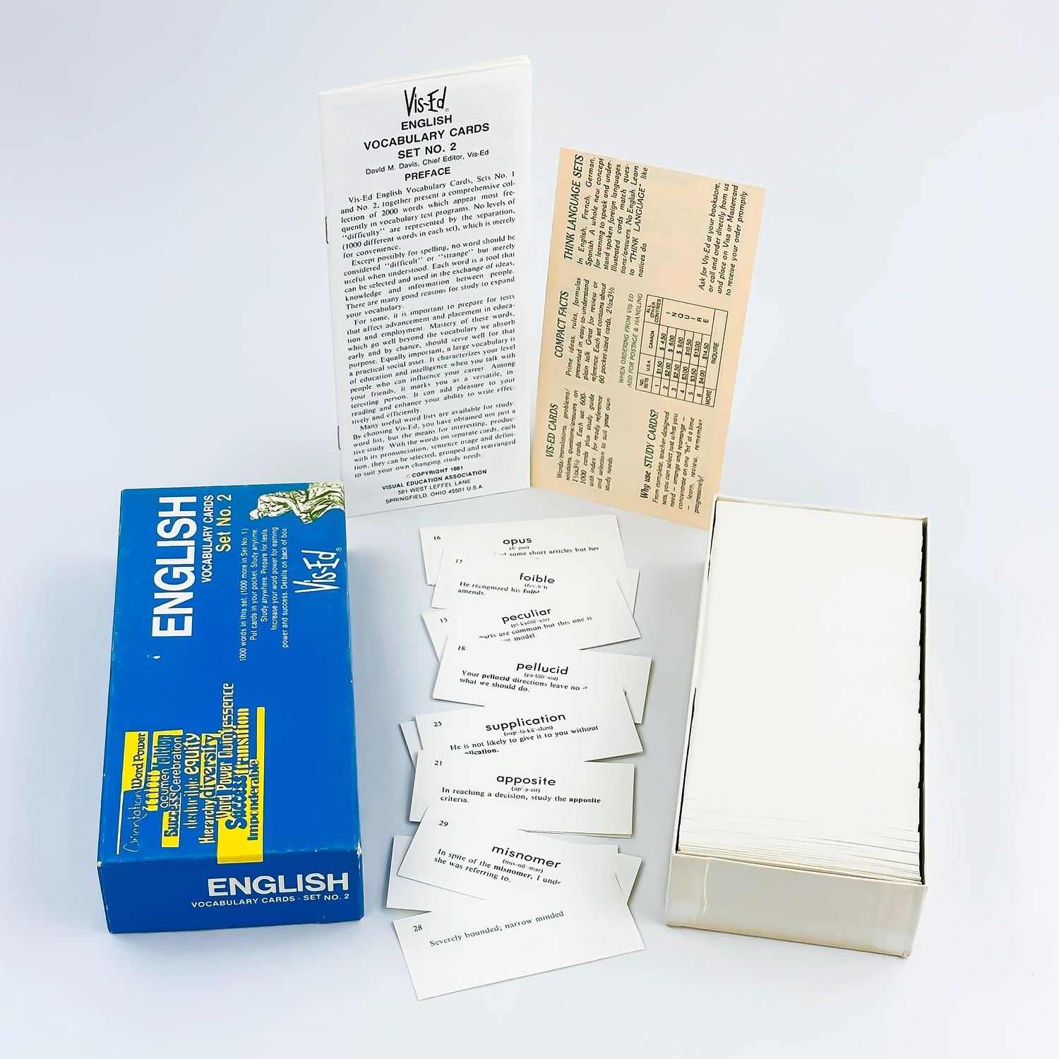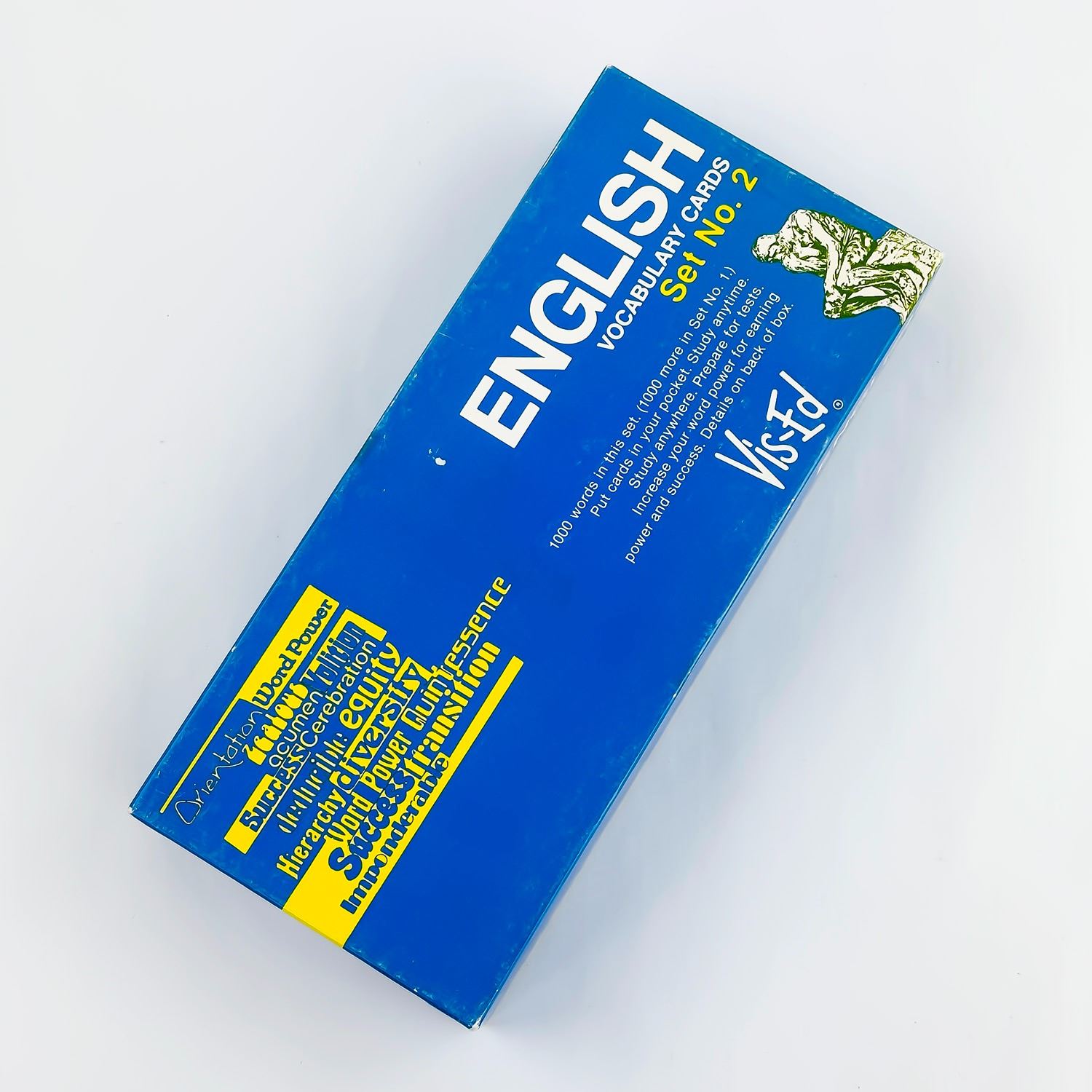 #8546 - ENGLISH VOCABULARY (FLASHCARDS) CARD SET - NO. #2 - BY VIS-ED - VISUAL EDUCATION. LEARN ENGLISH VOCABULARY - 1000 CARDS SET - APPEARS COMPLETE - DID NOT COUNT CARDS. BOX MEASURES: 8.5” (21.5 CM) LONG BY 3.75” (9.5 CM) WIDE AND SITS 1.5” (4 CM) HIGH
