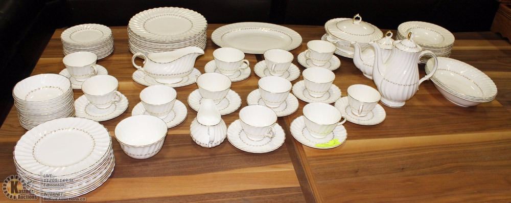 BONE CHINA "ADRIAN" INCLUDING TEA POT, COFFE POT, SALAD PLATES, COVERED CASSEROLE, DESERT BOWLS AND SO MUCH MORE