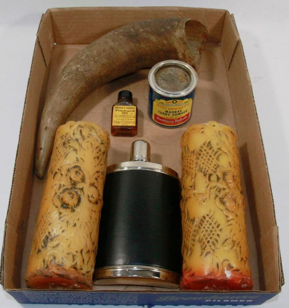 BOTTLE AND ANIMAL HORN. COLLECTIBLES