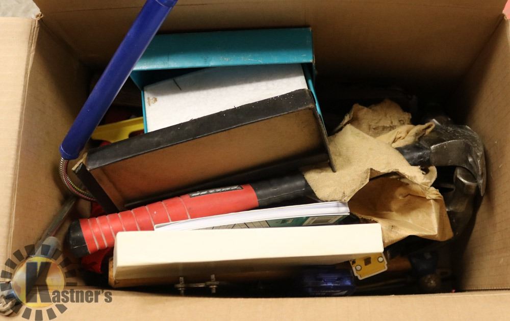 ESTATE BOX OF ASSORTED HAMMERS, AXE AND HAND