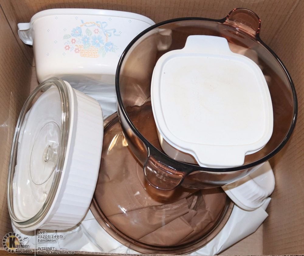 ESTATE BOX OF CASSEROLE DISHES & MORE