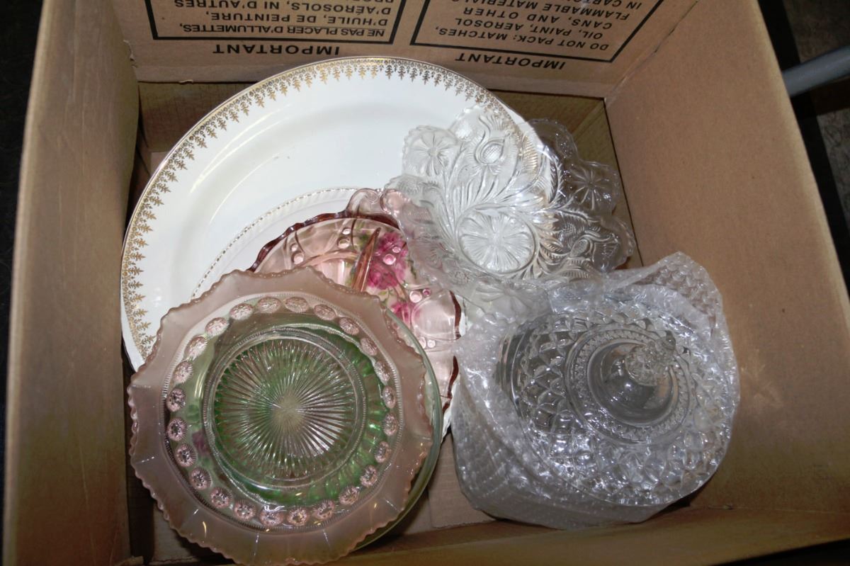 ESTATE BOX OF COLLECTIBLE TRAYS, GLASS SERVERS ETC