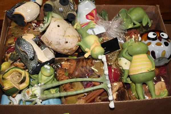 ESTATE BOX W POTPOURRI AND FROG ORNAMENTS ETC