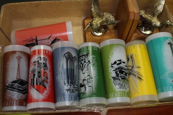 ESTATE BOX W VINTAGE GLASSES AND BOOK ENDS