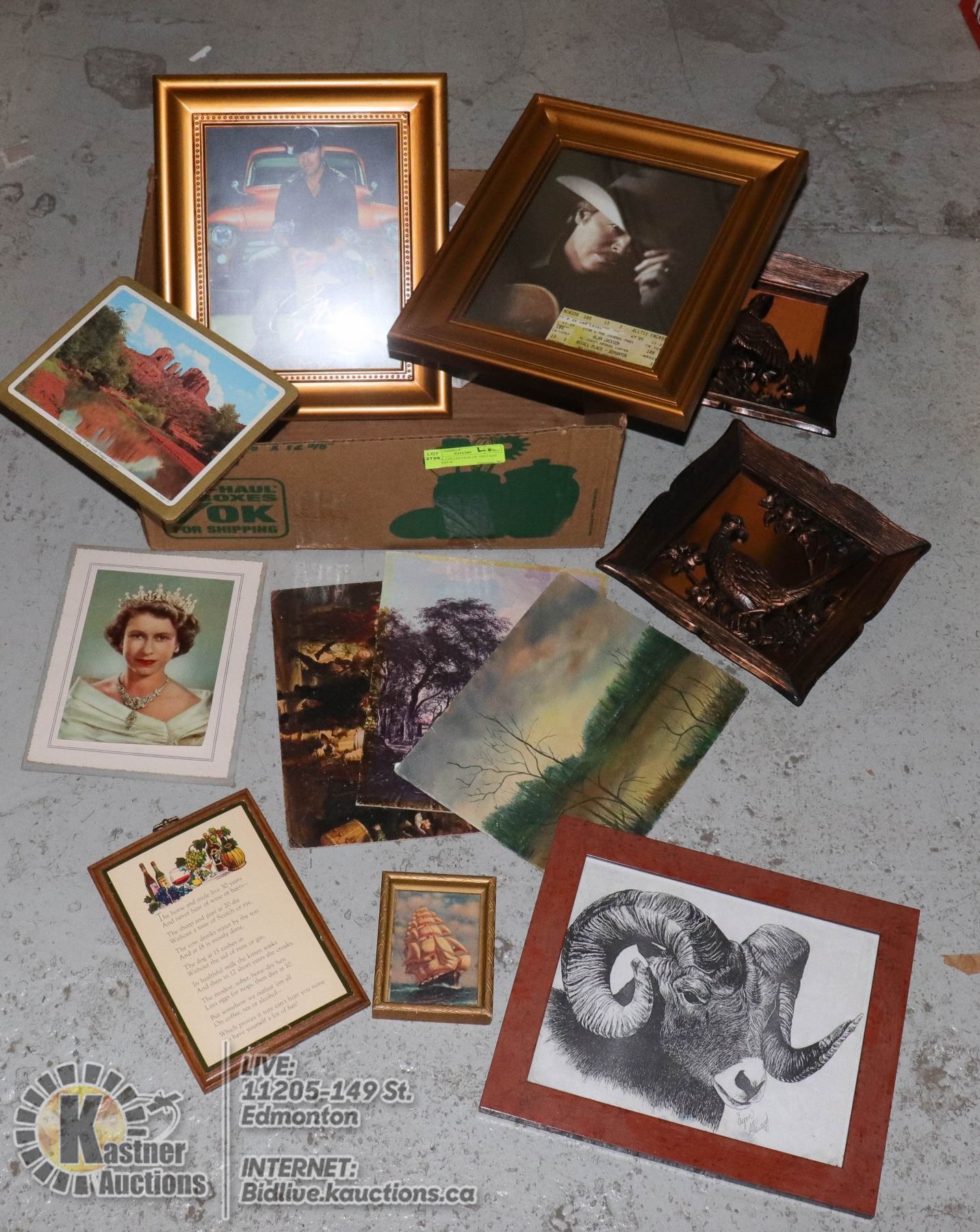 ESTATE COLLECTION OF VINTAGE PICTURES & PLAQUES INCL. QUEEN ELIZABETH, ALAN JACKSON, GEORGE CANYON,