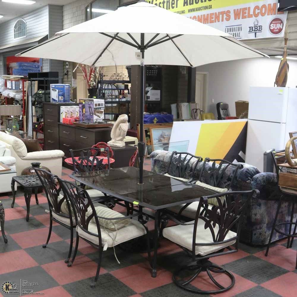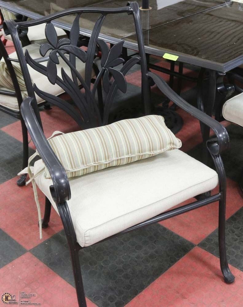 4 ARM CHAIRS AND 2 SWIVEL ARM CHAIRS, 6 CUSHIONS, 6 BACKRESTS, PARASOL BASE AND 3 SMOKE TABLE TOP INSERTS. OUTDOOR