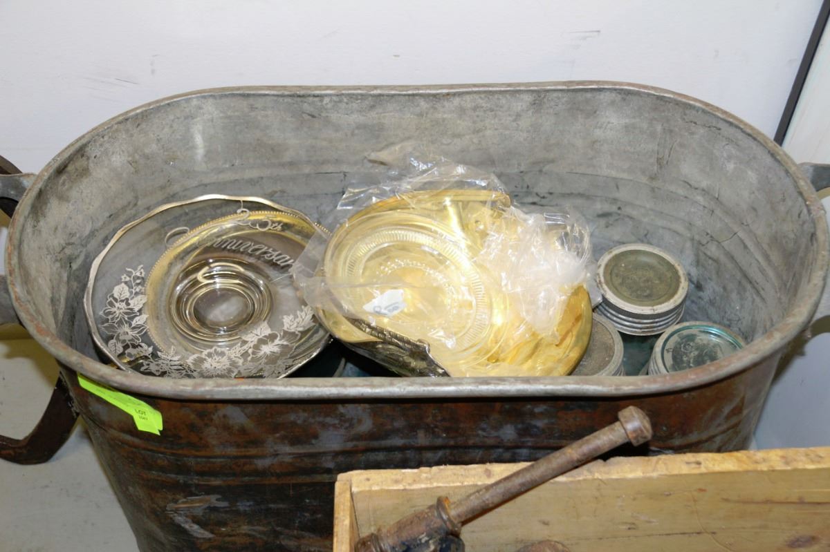 ESTATE TIN BUCKET WITH OLD JARS, IRON ETC