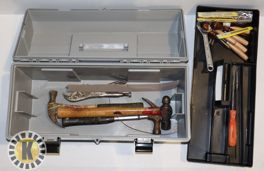 ESTATE. LARGE TOOL BOX TOOLS INCLUDE: 9 CARVING TOOLS, SCREWDRIVER, HAMMERS, WRENCH, KNIFE AND PLIER***ITEM(S) LOCATED IN LETHBRIDGE ALBERTA