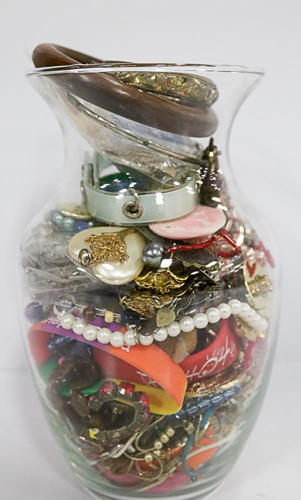 ESTATE VASE OF COSTUME JEWELRY, BRACELETS, EARINGS