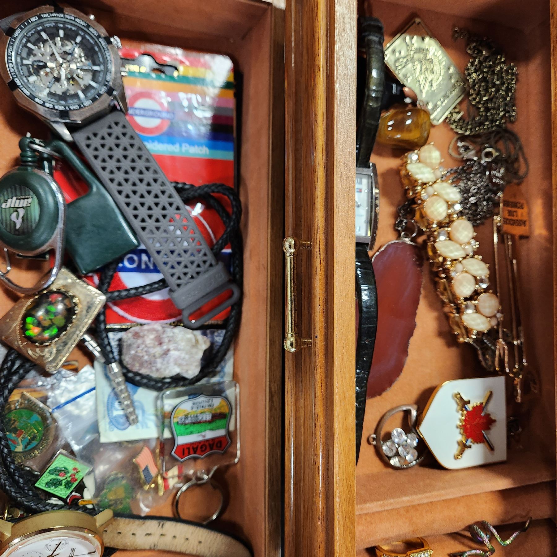 BUTLER JEWELLERY BOX WITH HILFIGER WATCH, NECKLACES, RINGS, PINS, PENDANTS, PATCHES, MEN'S WATCHES, GEMSTONES, BRACELET **ALL ITEMS MUST BE REMOVED BY 5PM SATURDAY, NOVEMBER 29TH 2025. ALL REMAINING ITEMS WILL BE SUBJECT TO A $6.00 PER DAY STORAGE CHARGE. ANY ITEMS REMAINING AFTER MONDAY, DECEMBER 15TH 2025 WILL BE CONSIDERED FORFEITED. NO REFUNDS WILL BE ISSUED FOR FORFEITED ITEMS. TO SCHEDULE A PICK UP APPOINTMENT CLICK HERE
