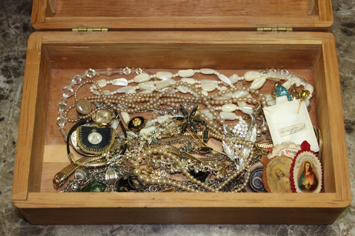 ESTATE WOOD BOX WITH JEWELLERY