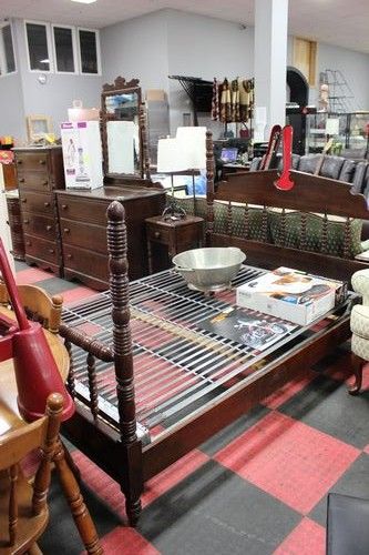 SUITE INCLUDES 5 DRAWER CHEST OF DRAWERS/DRESSER W MIRROR/END TABLE/HEADBOARD/FOOTBOARD/RAILS AND METAL BOXSPRING