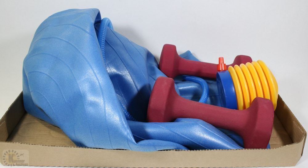 EXERCISE BALL W/ PUMP AND SET OF 8LB WEIGHTS