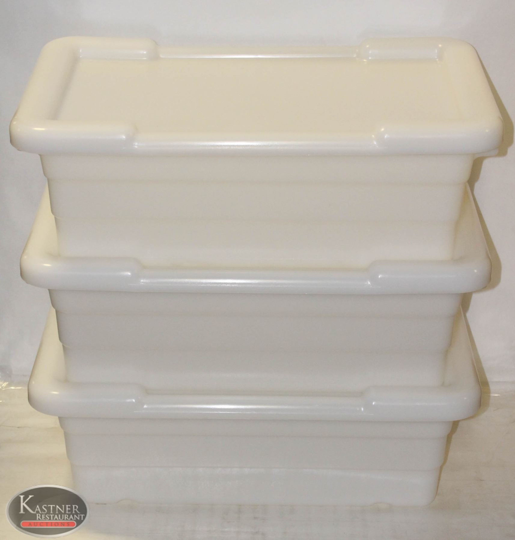 K NEW EXTRA HEAVY DUTY POLY LUGS, 25" X 16" X 8.5", WHITE WITH LID - LOT OF 3 - (6 PIECES)