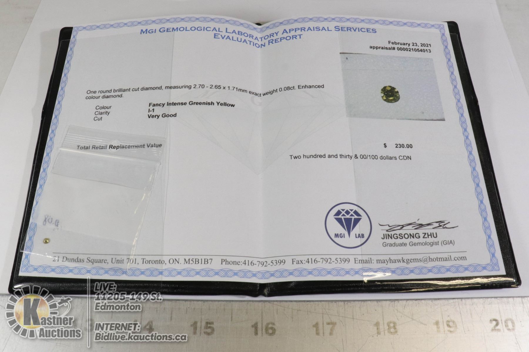 .08 CARAT ENHANCED FANCY YELLOW DIAMOND WITH PROFESSIONAL MGI APPRAISAL. I1 GREENISH YELLOW APPRAISED AT $230.00