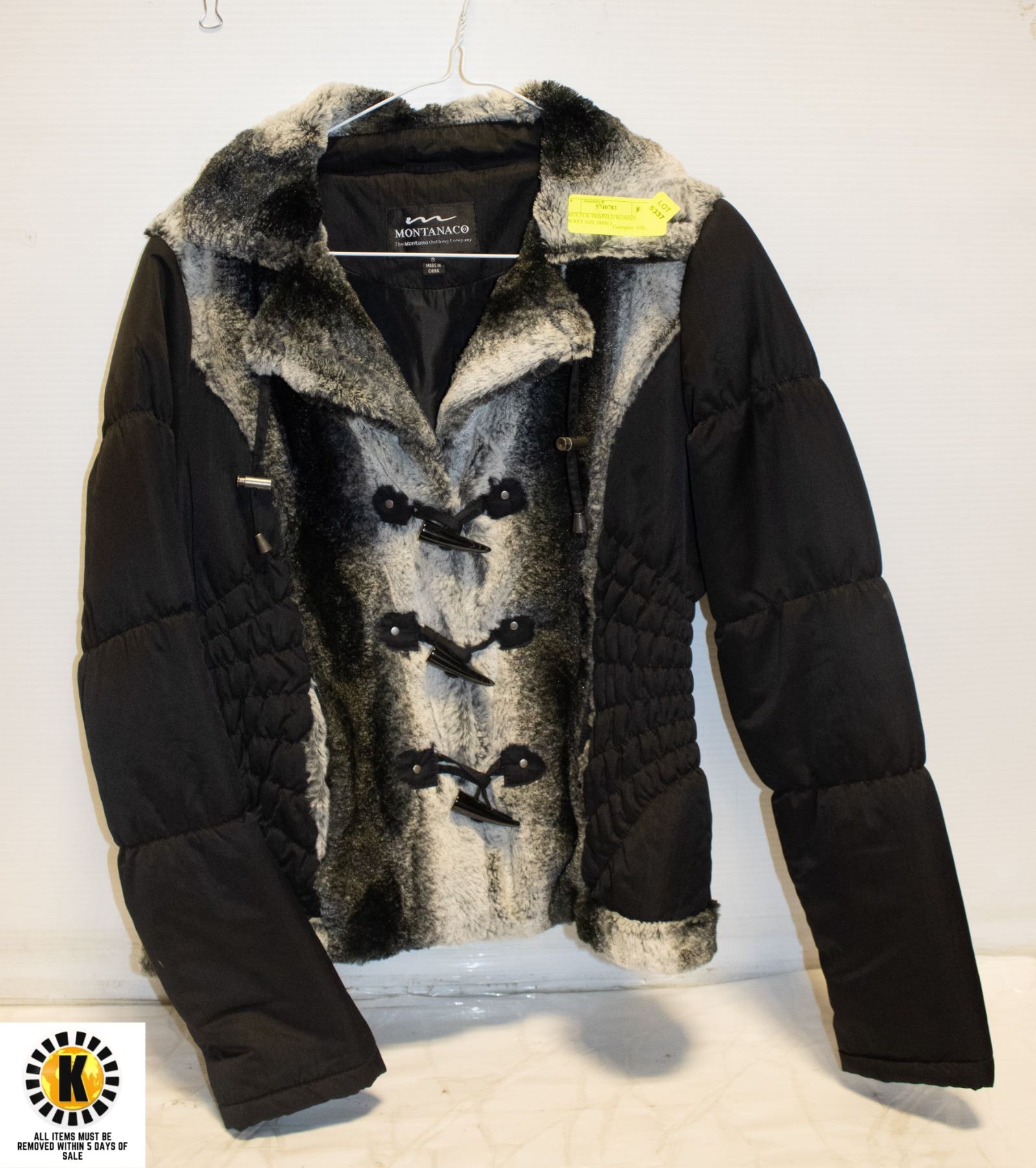 FAUX FUR TRIMMED WOMAN JACKET WITH INVISABLE POCKETS, MONTANACO, SIZE SMALL