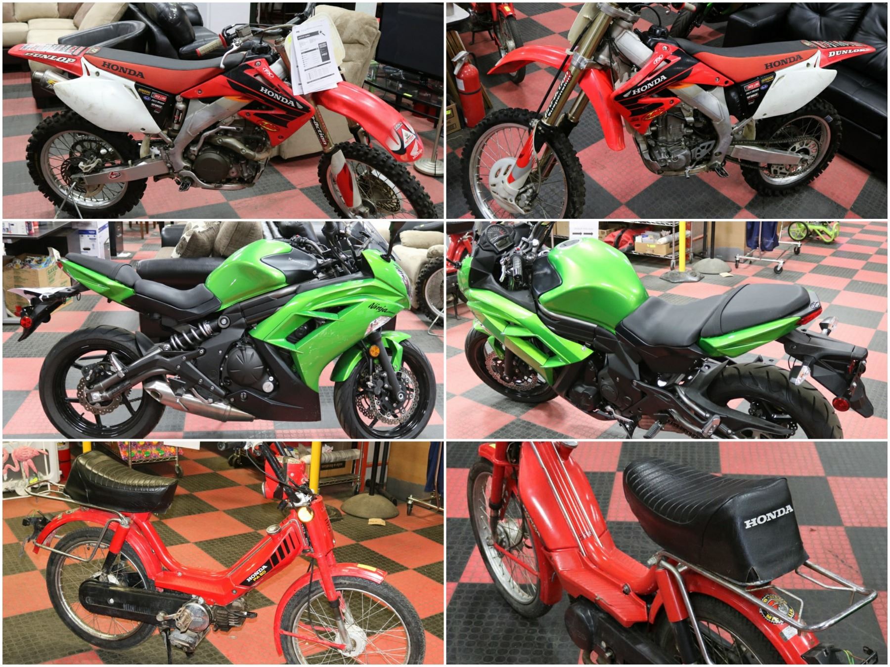 LOTS 355 - 2012 KAWASAKI EX 650 EC NINJA MOTORCYCLE , 360 - 1979 HONDA MOPED PA50 RUNS . AS IS , 365 - UNRESERVED! 2003 HONDA CRF450R .