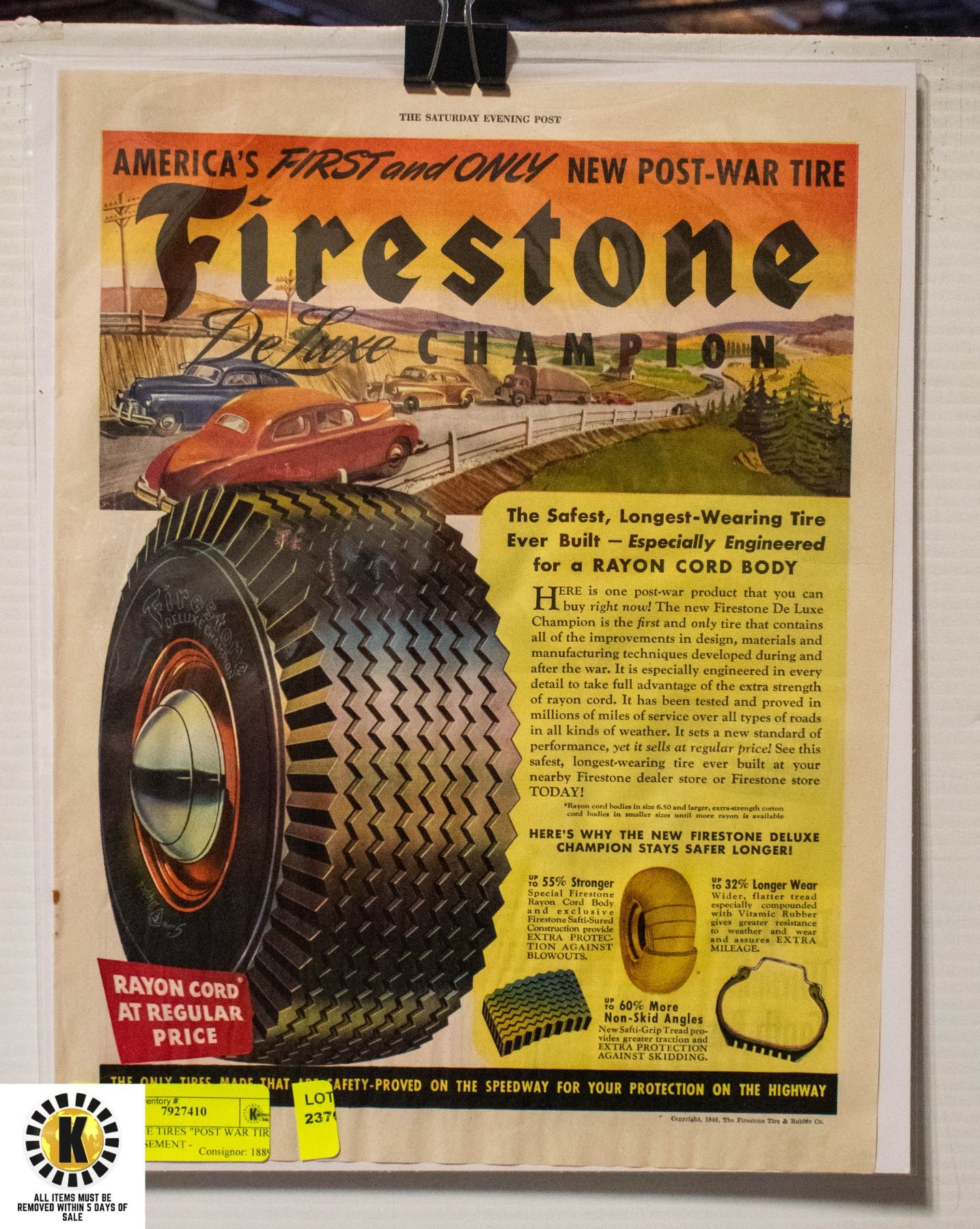 FIRESTONE TIRES "POST WAR TIRE" ADVERTISEMENT - 1940'S ORIGINAL AD.