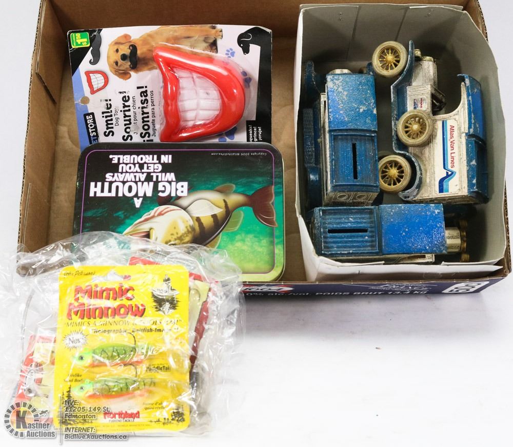FISHING HOOKS TIN & 3 ATLAS VAN PIGGY BANKS.