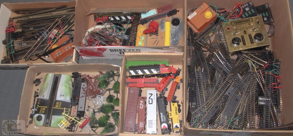 FIVE BOXES OF MODEL TRAIN CARS, ENGINES, TRACKS, &